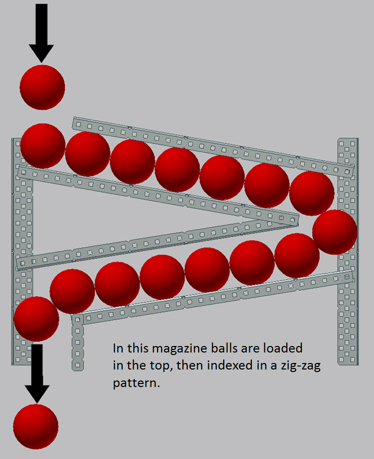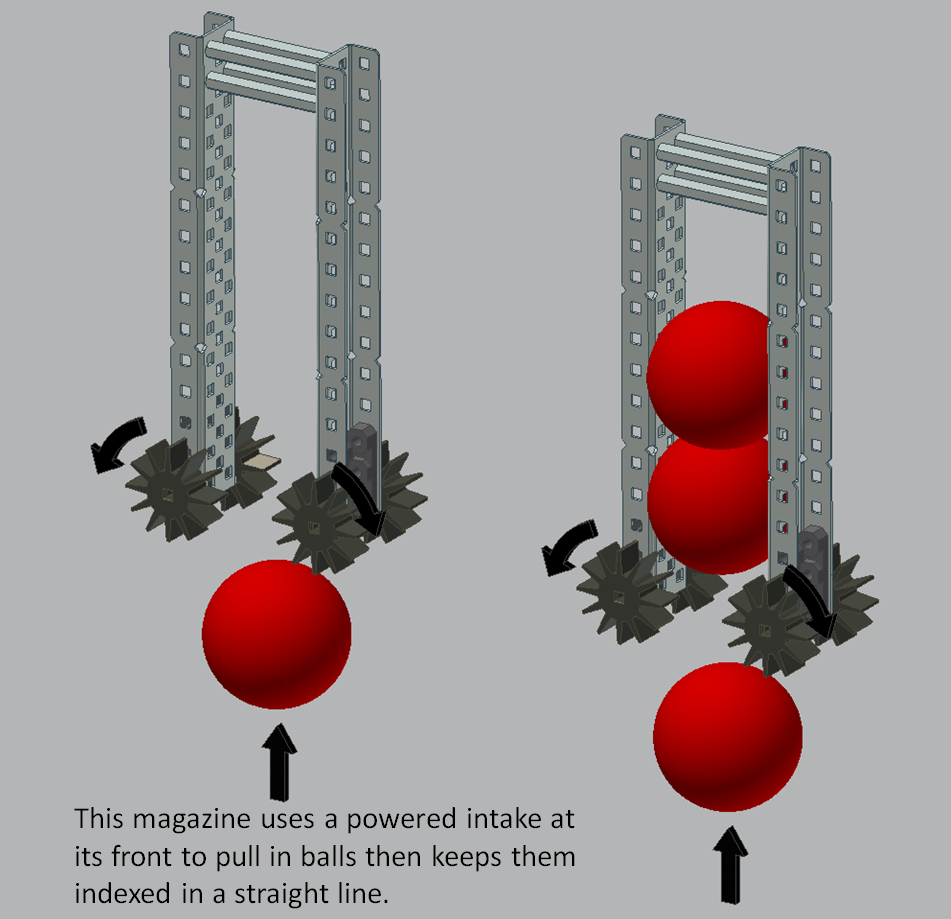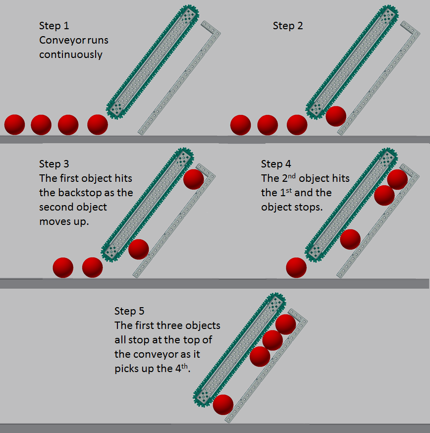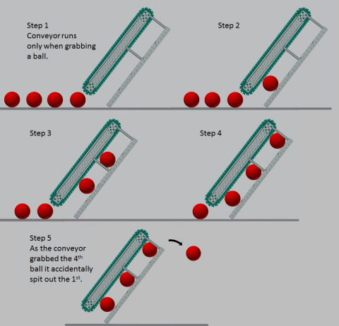 A non-indexing conveyor belt as shown above continuously runs. When the first object is grabbed it moves to the top of the belt until it hits the back of the accumulator where it hits a stop and the belts slide past it. When a second object is grabbed it moves up until it hits the first, and stops (at which point the belt now slides past both of these stationary objects). This type of accumulator is easier to use, but is more difficult to design. For this type of accumulator to function correctly the robot designer must ensure that the objects “self-sort” correctly, that is they don’t bunch up into configurations where they will jam the belts. The designer must also ensure that the frictional force between the belt and the object is enough to pull the object in, but not too much so that the belt stops when the objects are resting against the stop. Once correctly configured this type of accumulator can be very successful in competition robotics.