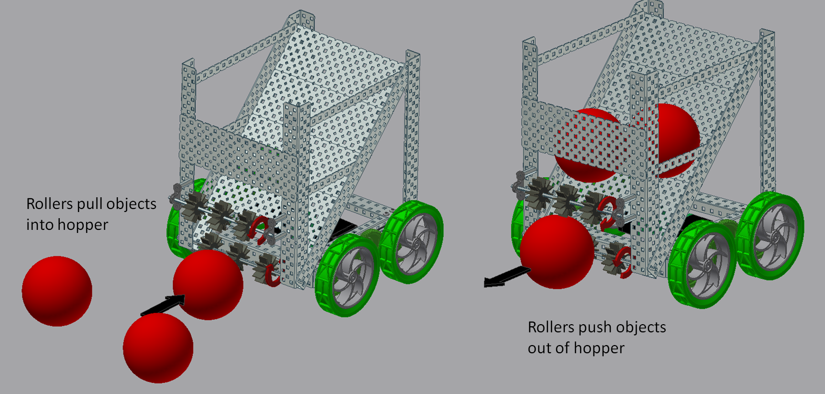 In this accumulator the objects are sucked into a large bin by two rollers. To score them the robot simply reverses the rollers and pushes the objects back out.