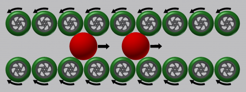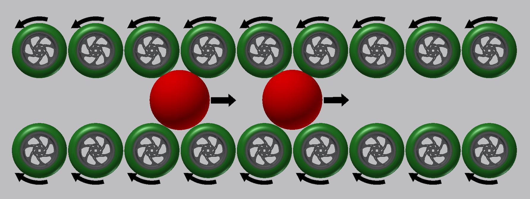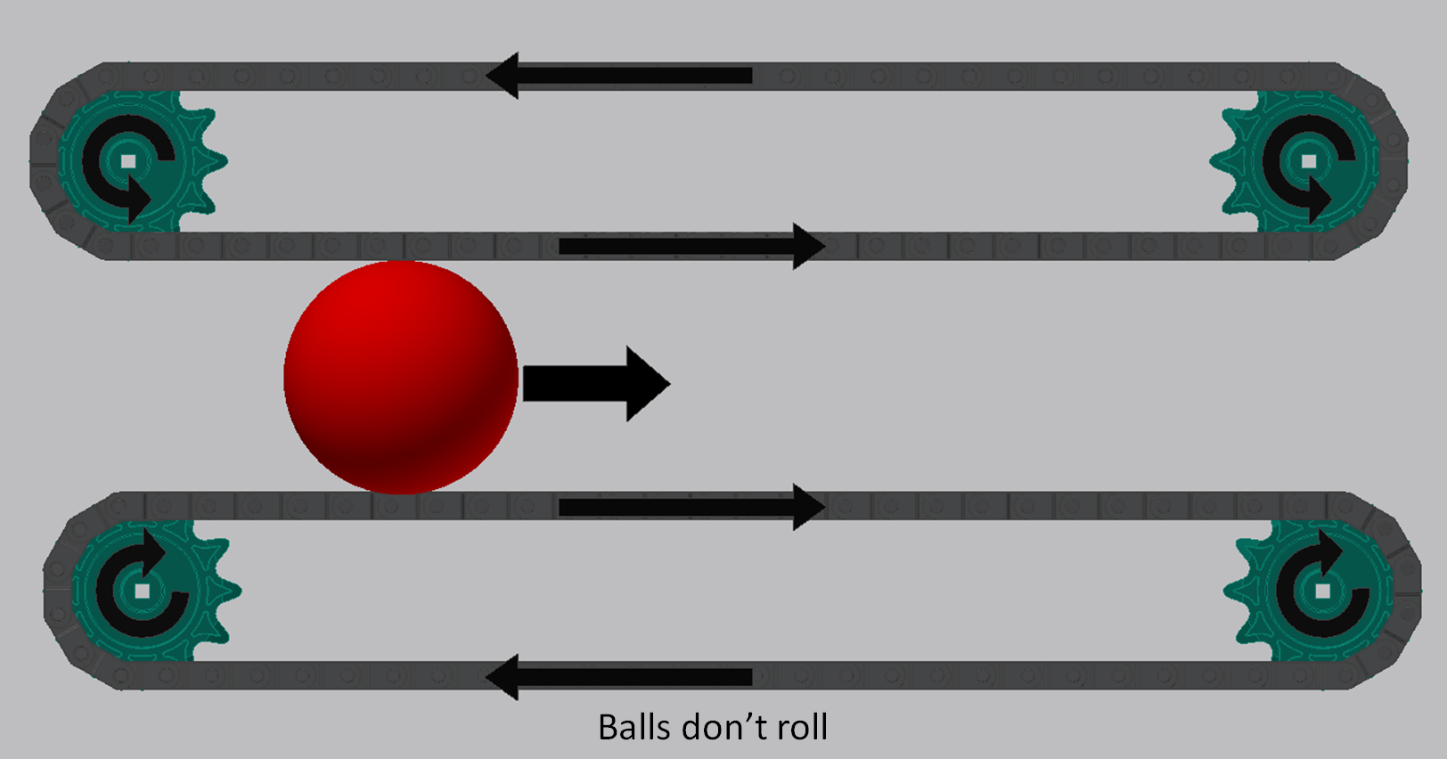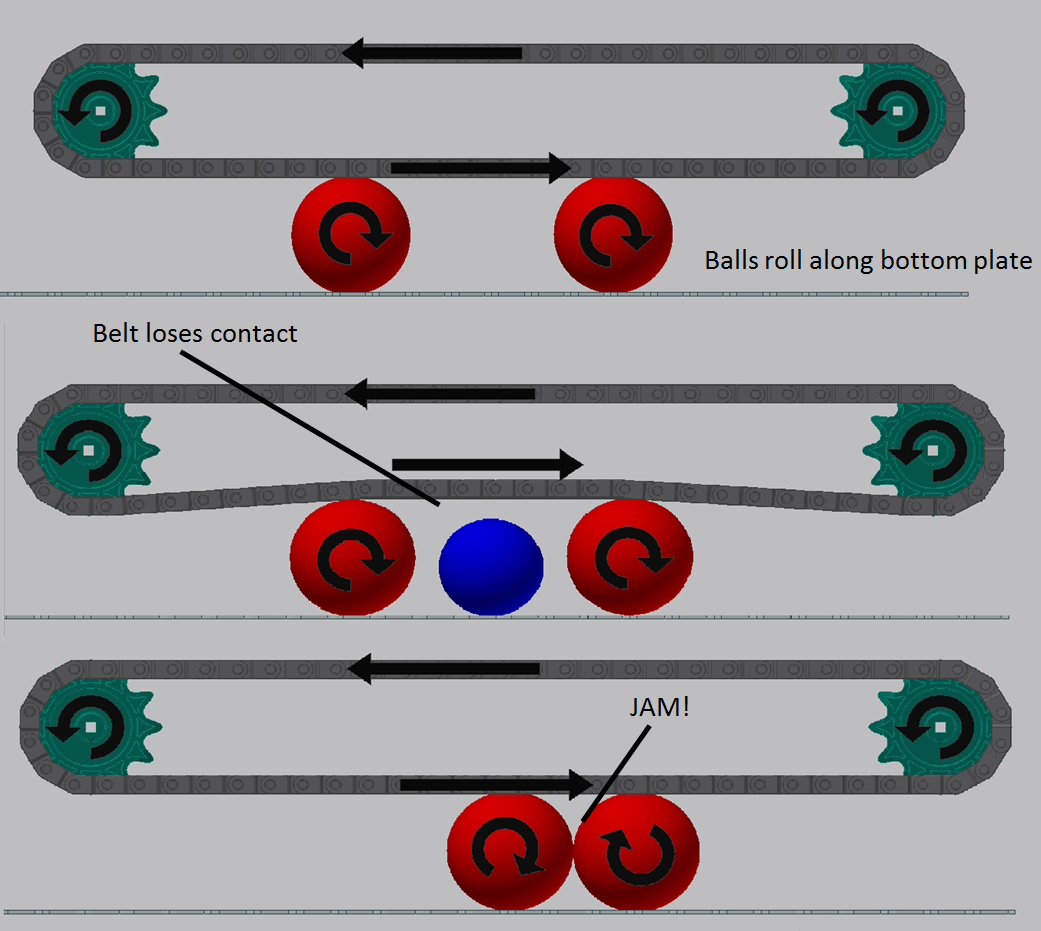 In this type of conveyor, the belt contacts the balls on one side and rolls them up the opposing surface. This relatively simple setup requires only one conveyor belt. However, this setup has some disadvantages. First, since the balls are rolling, they move through the accumulator at half the speed of the conveyor belt. Second, this setup is subject to jamming if two balls are picked up too closely together and they touch inside the conveyor. Because the back side of the ball in front is moving up while the front side of the ball in back is moving down, the balls can bind up and jam. This type of system needs to be tuned very carefully to ensure that one object doesn’t push up on the belt such that it loses contact with the next object. It is difficult to ensure that the conveyor will be able to provide the correct amount of frictional force on all objects inside.