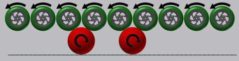 In this setup, each of the rollers is linked to the power source. This system is less likely to jam, but is still subject to many of the problems found in the first setup. Also, using many rollers instead of a single belt adds significant complexity.