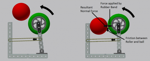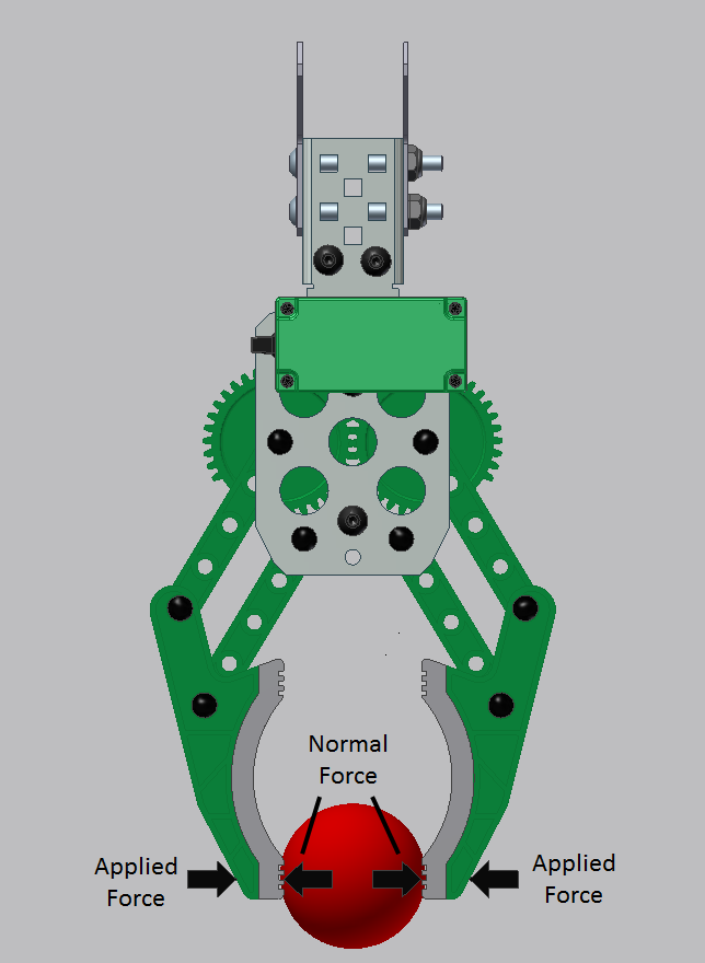 The above image shows the force exerted by the claw fingers on the ball, and the resulting normal forces.