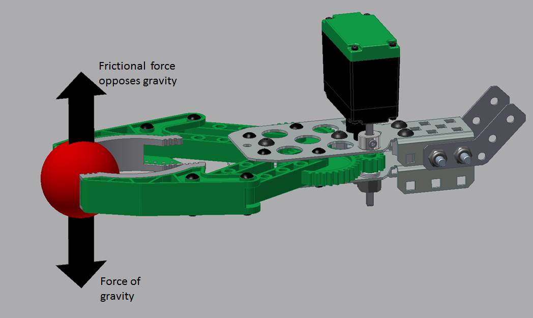 The above image shows the friction force between the ball and claw fingers opposing the force of gravity pulling down on the ball.